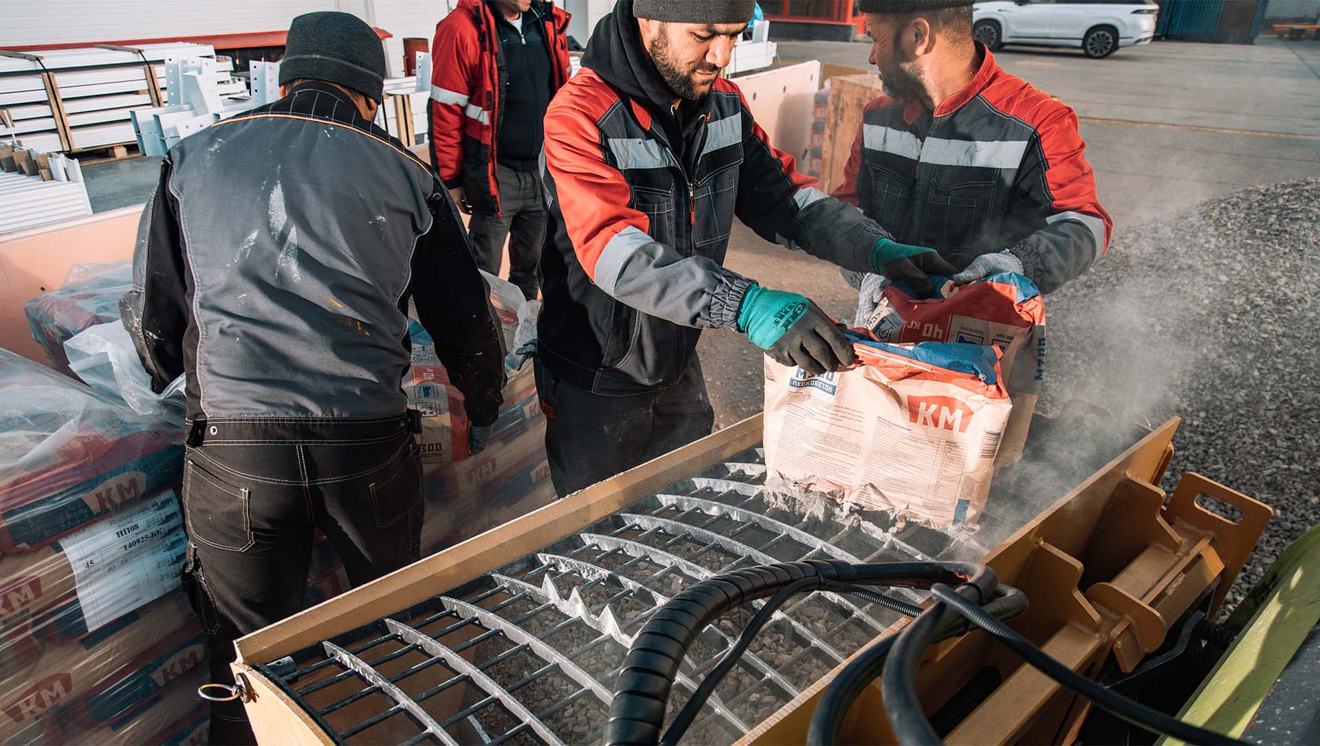 Ковш также оснащен металлической решеткой, которая защищает внутренние механизмы от попадания крупных посторонних предметов. Эта решетка служит не только защитой, но и удобным инструментом для вскрытия мешков с цементом.
